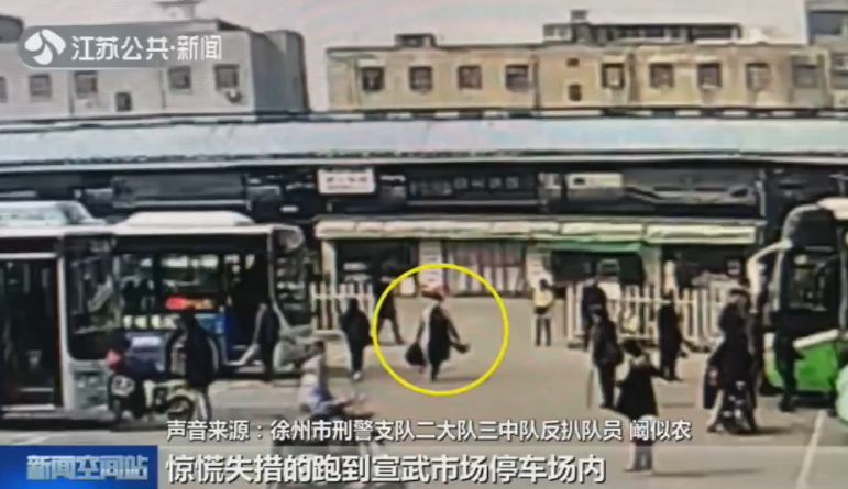 監(jiān)控畫面顯示,一名女子偷走背包之后,驚慌失措地跑到宣武市場停車場內(nèi)。