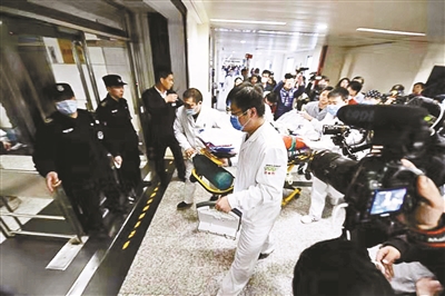 到達中日友好醫院后,患者被抬下救護車(左圖),醫護人員將患者推入病房(右圖)