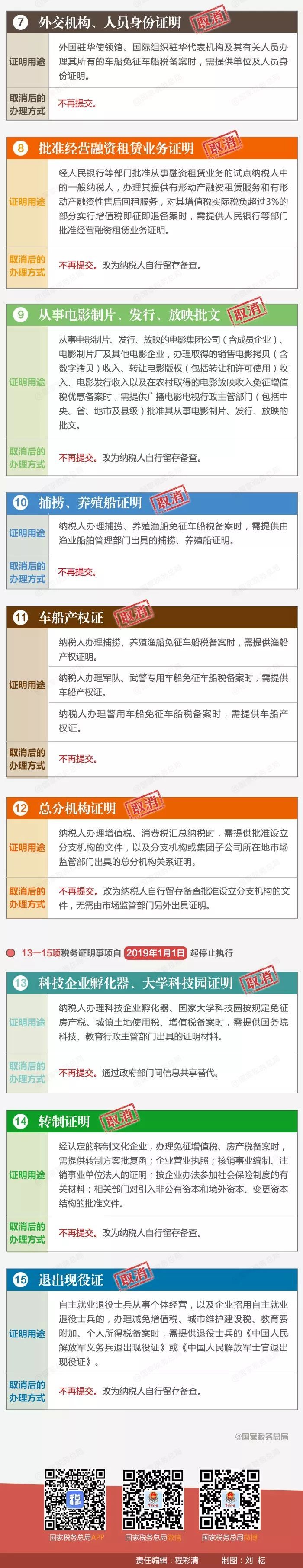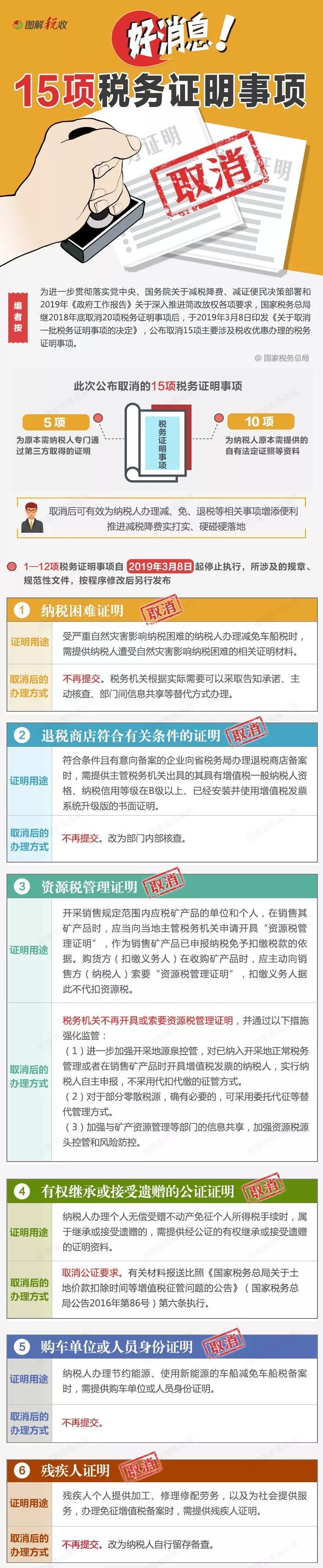 為進(jìn)一步貫徹落實黨中央、國務(wù)院關(guān)于減稅降費、減證便民決策部署和2019年《政府工作報告》關(guān)于深入推進(jìn)簡政放權(quán)各項要求,國家稅務(wù)總局繼2018年底取消20項稅務(wù)證明事項后,于2019年3月8日印發(fā)《關(guān)于取消一批稅務(wù)證明事項的決定》,公布取消15項主要涉及稅收優(yōu)惠辦理的稅務(wù)證明事項。取消事項具體包括哪些?取消后如何辦理?戳圖了解