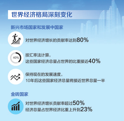 上一個百年是世界發生巨變的百年,是人類歷史上驚心動魄的百年。就世界秩序而言,最大的變動是發生了兩次世界大戰,美國成為世界上最強大的國家,西方集團確立。還有一個變動就是俄國十月革命爆發,蘇聯成為世界上第一個社會主義國家,世界社會主義興起,社會主義陣營出現。第二次世界大戰后,兩方面力量在冷戰中對峙了幾十年,最終以東歐劇變、蘇聯解體而結束,美國成為世界上唯一超級大國。同時,還有一個變動影響巨大,那就是民族獨立運動興起,資本主義殖民體系瓦解,發展中國家紛紛實現民族獨立。伴隨著經濟全球化加速推進,不少發展中國家獲得長足發展,新興市場國家和發展中國家整體力量呈現上升趨勢。