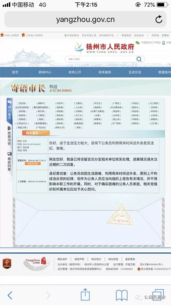 1月16日寶應縣紀委在揚州市人民政府網站“寄語市長”頻道的回復。