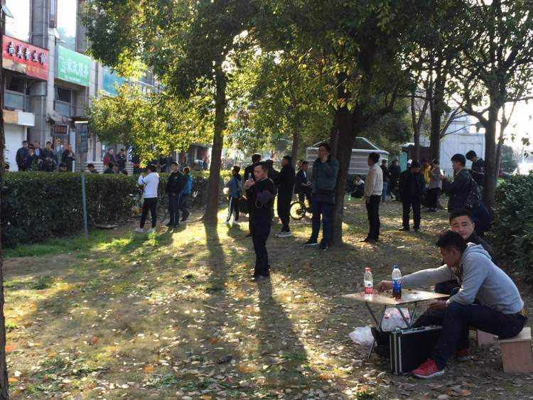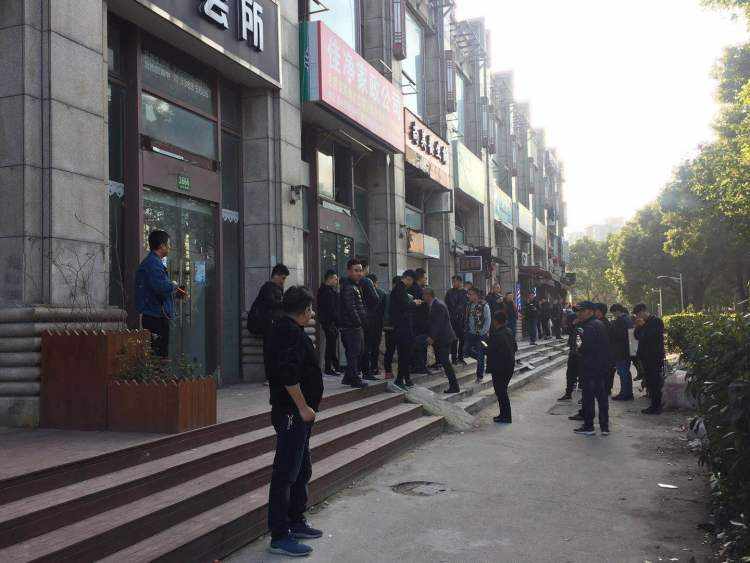 沈巍在進入裝修的店鋪后沒有再出來。外面幾十號人要么倚在樹上等待,要么自顧自的做起直播。有兩位年輕人支起小桌板搬來兩張凳子,買了一箱礦泉水放在桌旁,大有不等到人不罷休之勢。