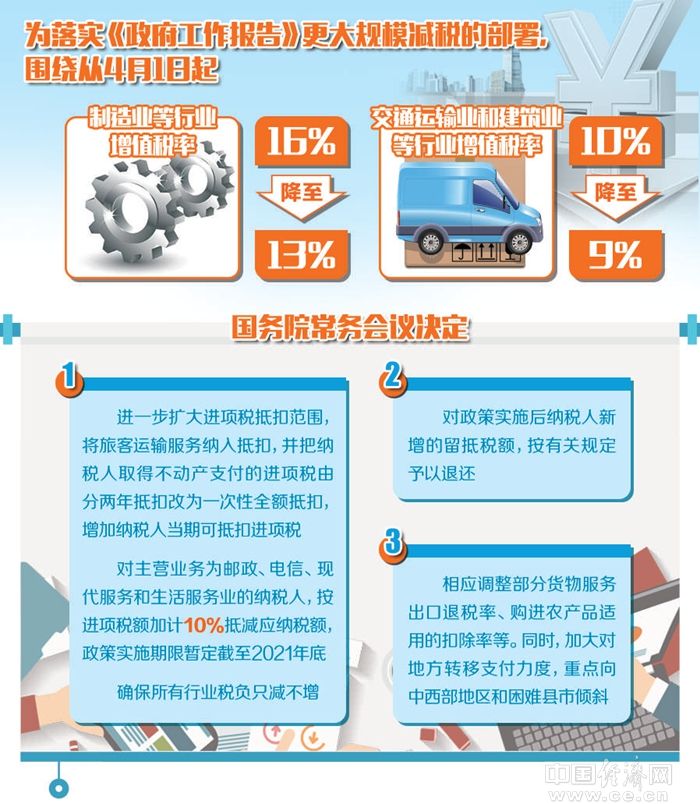 日前,國務院常務會議明確增值稅減稅配套措施,部署落實《政府工作報告》更大規模減稅。