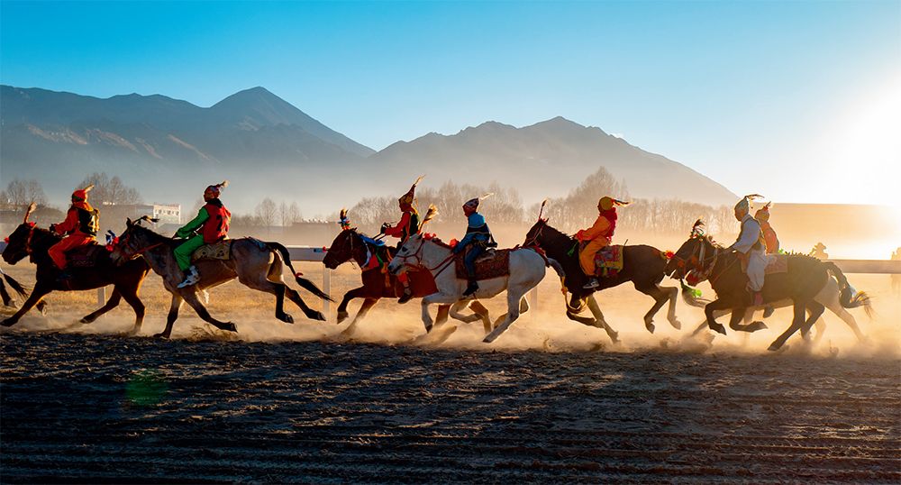 2月7日,騎手在拉薩北郊賽馬場上進行民間賽馬活動和傳統馬術表演 普布扎西攝