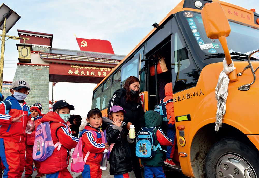 2018年3月27日,“西藏民主改革第一村”克松社區的孩子們登上校車出發去幼兒園 覺果攝
