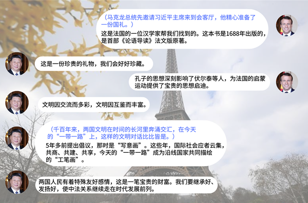 “文明因交流而多彩,文明因互鑒而豐富。”習近平主席上一次到訪法國是在5年前,他的演講闡釋了對文明互鑒的思考。千百年來,兩國文明在時間的長河里奔涌交匯,在今天的“一帶一路”上,這樣的文明對話比比皆是。古絲綢之路的復興,也是文明的復興。習近平主席說,5年多前提出倡議,那時是“寫意畫”。這些年,國際社會應者云集,共商、共建、共享,今天的“一帶一路”成為沿線國家共同描繪的“工筆畫”。