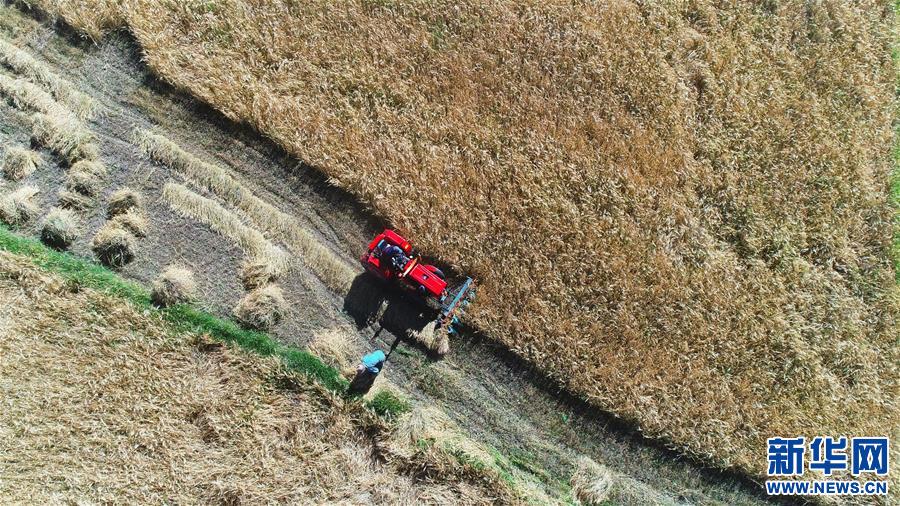 西藏定日縣農民在收割青稞(2018年9月13日無人機拍攝)。新華社記者 普布扎西 攝