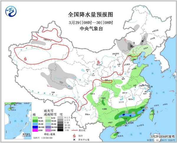 今天,隨著冷空氣東推南移,降水重心將轉移到廣東和福建等地,局地有暴雨并將伴有短時強對流天氣。中央氣象臺預計,3月29日08時至30日08時,江南南部、華南中東部、貴州北部等地有中到大雨,其中廣東北部、福建東部局地暴雨(50~55毫米)。