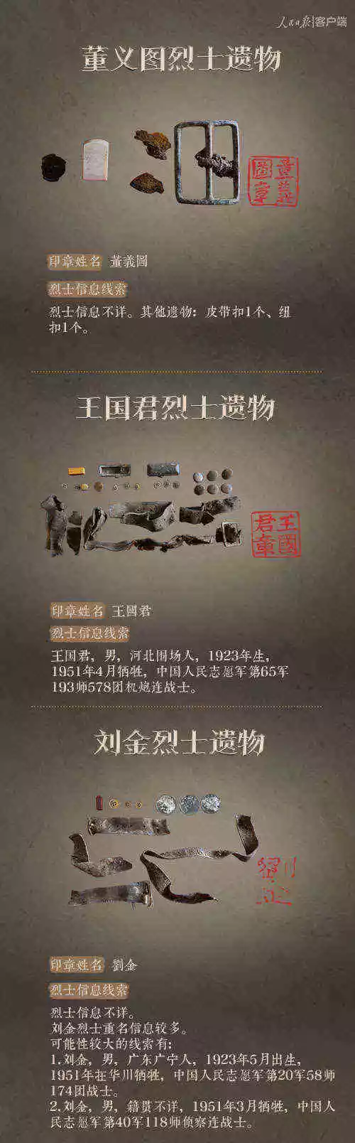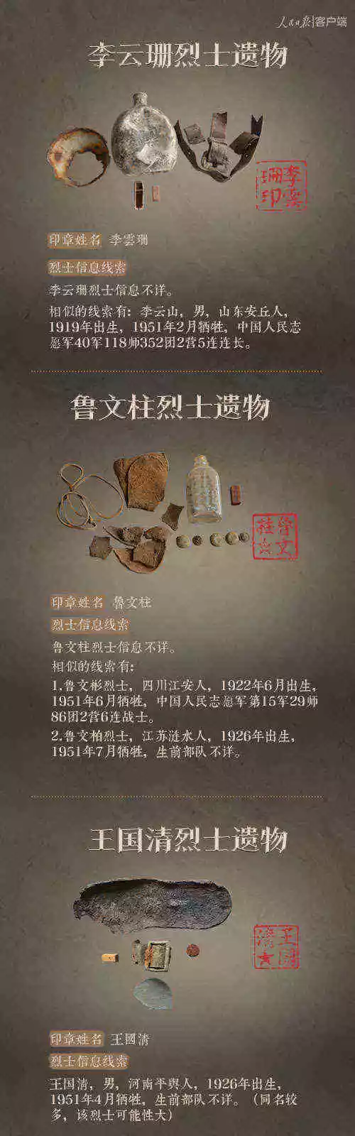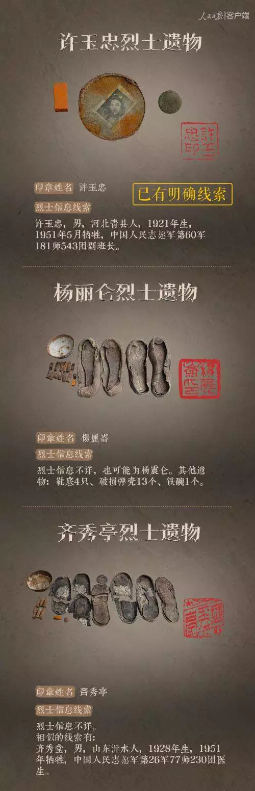 2014年以來,先后有五批589位在韓志愿軍烈士遺骸回到祖國懷抱。退役軍人事務部從這些烈士的上千件遺物中,發現了姓名文字圖案清晰可見的24枚印章。近日與人民日報新媒體等共同發起#尋找英雄#媒體行動,向全社會征集這24位烈士親屬線索。3月29日,人民日報客戶端、法人微博、微信公號同時發布稿件《當年,他們為我們犧牲;今天,請為他們做一件事》,向社會介紹“尋找英雄”活動,并公布24位烈士的基本情況和遺物信息。