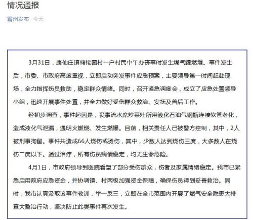 通報稱,3月31日,康仙莊鎮栲栳圈村一戶村民中午辦喪事時發生煤氣罐燃爆。事件發生后,市委、市政府立即啟動突發事件應急預案,主要領導第一時間趕赴現場,全力指揮傷員救助,穩定群眾情緒。同時,召開緊急調度會,成立了應急處置領導小組,迅速開展事件處置,并全力做好受傷群眾救治、安撫及善后工作。