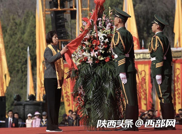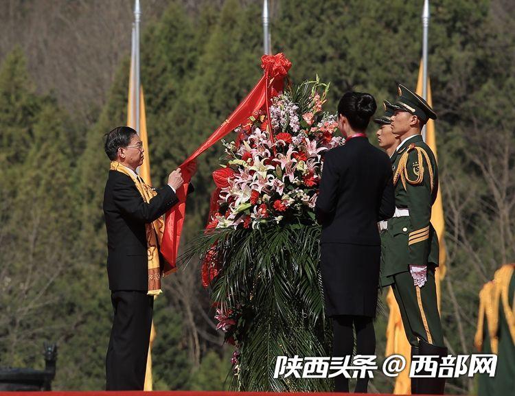 隨后,中共陜西省委書記、省人大常委會主任胡和平代表中共陜西省委、省人大常委會、省政府、省政協和陜西各界;全國人大常委會委員、海峽兩岸關系協會會長張志軍,中共中央統戰部副部長、國務院僑務辦公室主任許又聲,中華全國歸國華僑聯合會主席萬立駿代表主辦單位;全國人大常委會委員、外事委員會副主任委員、民革中央專職副主席張伯軍,民進中央副主席兼秘書長高友東,農工黨中央副主席兼秘書長曲鳳宏,中國作協名譽委員、中國散文學會會長王巨才,全國青聯主席、中國致公黨中央委員會常委、中國致公黨中央海外聯誼專委會主任李嶸代表民主黨派、中央和國家機關、人民團體;山西省政協副主席李青山,江蘇省政協副主席王榮平,湖北省政協副主席王紅玲,甘肅省政協副主席郭天康,青海省政協副主席馬海瑛代表各省、區、市;十三屆全國政協常委、香港世茂集團董事局主席許榮茂,香港玖龍紙業集團董事長張茵,歐洲華僑華人社團聯合會秘書長、北歐中聯投資集團股份有限公司董事長曹燕靈,中華海外聯誼會理事陳文噸,中華海外聯誼會理事林懷宣,全澳中國和平統一促進同盟執行會長王然,美國俄勒岡州華人聯合會、統一促進會會長朱介眉,美國華裔民選官員協會會長、美國加州阿罕布拉市前市長沈時康,錢學森智庫專家、世界社會系統工程協會副主席常遠先生代表港澳同胞、海外僑胞;新黨主席郁慕明攜臺灣青少年代表;全國改革先鋒、我國首位奧運冠軍許海峰,全國青聯常委、文化學者、知名作家魏新,團中央委員、全國青聯常委、湘潭市青年創業協會會長楊懷保,中石油遼河油田分公司團委副書記米京博,中國空空導彈研究院高級技師邵志永,西安市公安局新城分局韓森寨派出所副所長汪勇,西安西電變壓器有限責任公司職工丁根榮,西安市公安局交警支隊新城大隊民警王振治,陜西省歌舞劇院歌劇團藝術指導郝萌,西京醫院肝膽外科副主任王琳代表全國改革先鋒、道德模范、勞動模范、時代楷模、三八紅旗手標兵、杰出青年、優秀科技工作者;中共陜西省委常委、延安市委書記徐新榮,省委黃帝陵文化園區工委書記、管委會主任、中共黃陵縣委書記孟中華代表守陵兒女敬獻花籃。