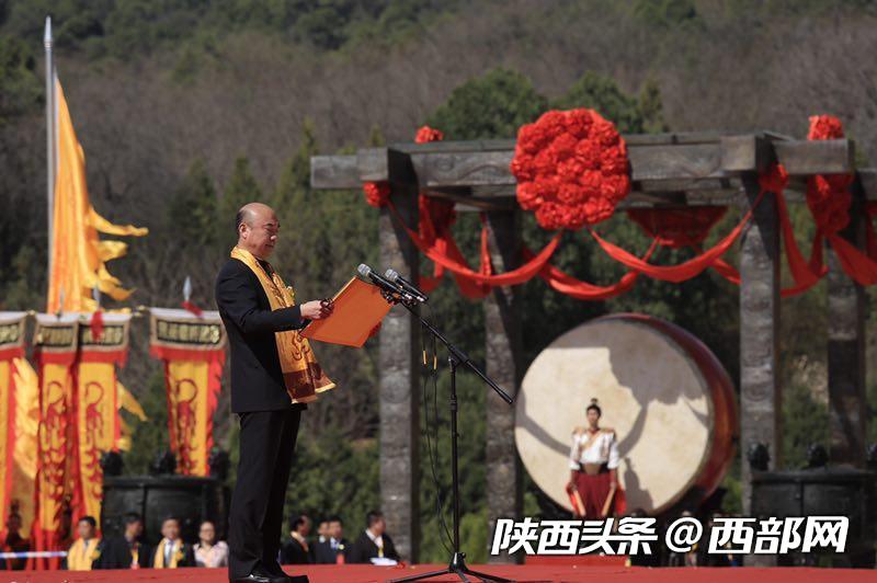 陜西省省長劉國中恭讀祭文:“歲次己亥,節屆清明;橋山巍麗,松柏翠凝。軒轅胄裔,肅戴虔敬,謹備尊禮,恭祭圣靈。辭曰: