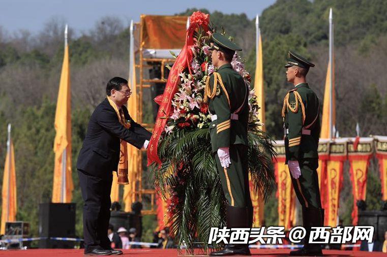 中共陜西省委書記、省人大常委會主任胡和平代表中共陜西省委、省人大常委會、省政府、省政協和陜西各界敬獻花籃。
