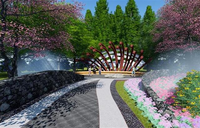 景觀布設(shè)突出了湖北特色,如湖北園入口處的“楚江映翠”景觀,以層疊的山峰造型營(yíng)造出層巒疊嶂的長(zhǎng)江三峽峽江意境,群峰之間多彩花卉和小型樁景呈現(xiàn)出峽江兩岸良好的生態(tài)環(huán)境和生物多樣性特質(zhì)。“楚簡(jiǎn)流芳”景觀,在沿園路兩側(cè)以抽象化的“楚簡(jiǎn)”構(gòu)建起一條楚文化時(shí)空隧道,分別以楚人、楚山、楚水為主題形成三組不同特色的花境園藝觀賞體驗(yàn)區(qū)。