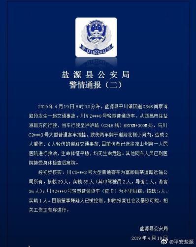 經(jīng)初步核實(shí):川C5***3號(hào)大型普通客車(chē)為富順縣某道路運(yùn)輸公司所有,核載39人,實(shí)載39人(其中駕駛員2人,導(dǎo)游1人,游客36人);川WZ***0號(hào)輕型普通貨車(chē)(皮卡)為木里縣籍,核載5人,實(shí)載1人。目前肇事嫌疑人已被控制,排除報(bào)復(fù)社會(huì)及暴恐可能。相關(guān)工作正有序進(jìn)行。