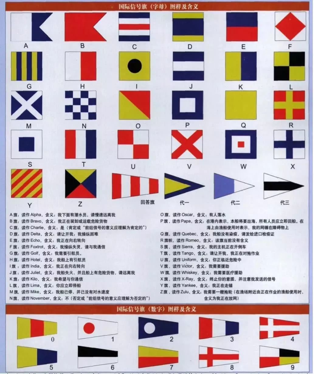 據(jù)悉,我國海軍通信旗包括26面字母旗、10面數(shù)字旗、3 面代旗、6面特種旗、1面國際答應(yīng)旗,共46面。