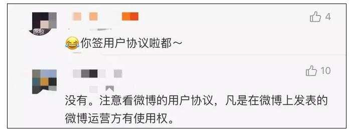 對此,有網友回應:“微博運營方對微博內容享有使用權。”