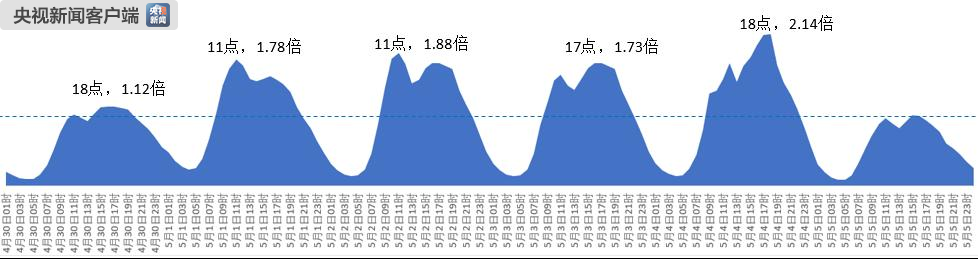 勞動節假期,高速公路網擁堵趨勢總體呈現“首尾高中間緩”特征。受勞動節假期延長一天等因素影響,假期第一天(5月1日)出行需求相比平日明顯提高,預計當日9時至11時擁擠程度約為平日4倍;假期第二天、第三天,擁擠程度有所緩解;假期最后一天(5月4日)16時至18時出現返程高峰,擁擠程度約為平日6倍,擁擠程度達到假期峰值;節后第一個工作日恢復到正常水平。