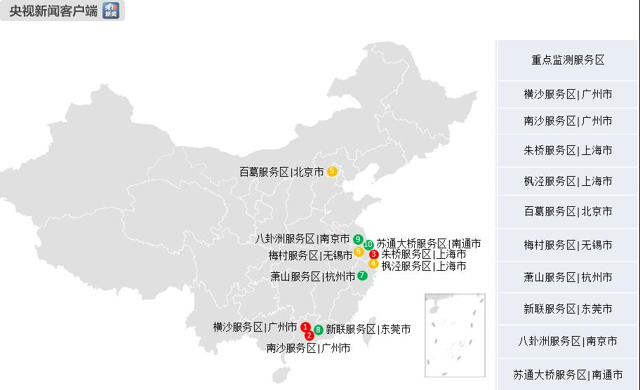 勞動節假期,重點監測服務區,預計主要有:北京市百葛服務區,廣州市橫沙服務區、南沙服務區,上海市朱橋服務區、楓涇服務區,無錫市梅村服務區,杭州市蕭山服務區,東莞市新聯服務區,南京市八卦洲服務區,南通市蘇通大橋服務區等。