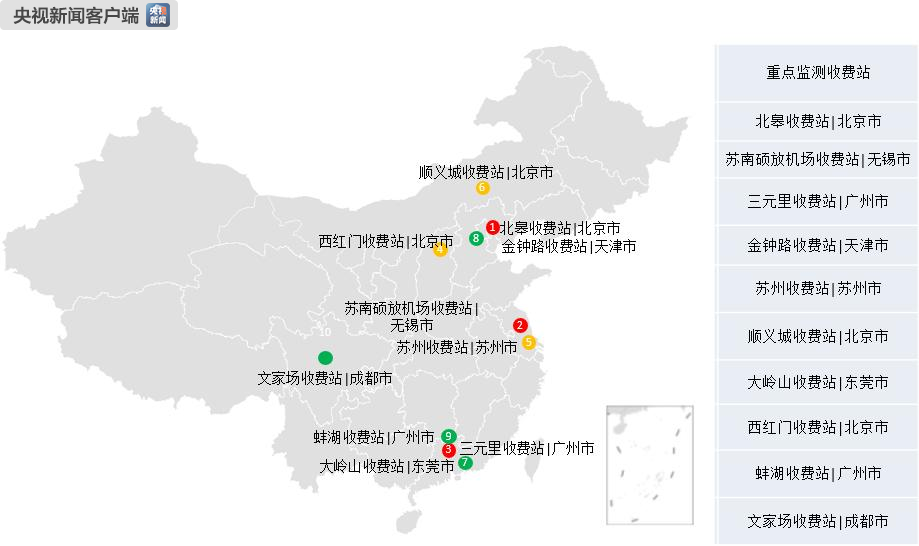 珠三角、長三角、京津冀及成渝地區部分收費站和服務區運行服務保障壓力較大。勞動節假期,預計:北京市北皋收費站、順義城收費站、西紅門收費站,廣東省廣州市三元里收費站、蚌湖收費站,廣東省東莞市大嶺山收費站,江蘇省無錫市蘇南碩放機場收費站,江蘇省蘇州市蘇州收費站,天津市金鐘路收費站,四川省成都市文家場收費站等交通運行壓力較大,易出現擁堵緩行,需提前做好運行保障工作并重點監測。