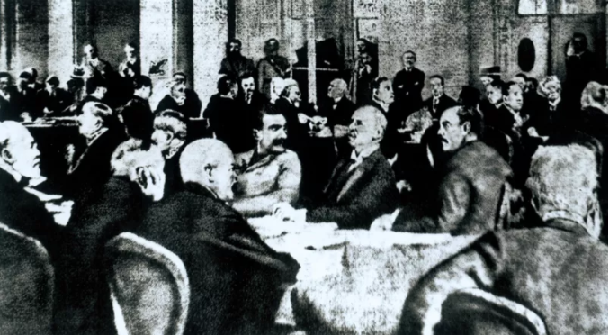 近代以來,帝國主義列強的侵略使中國逐步淪為半殖民地國家,帝國主義和中華民族的矛盾成為近代中國社會的主要矛盾之一。1919年1月,第一次世界大戰戰勝國在法國巴黎召開和會,把持和會的英法美等列強無視中國也是戰勝國之一,不顧中國民眾呼聲,竟然決定將戰敗國德國在中國山東的權益轉讓給日本。在巴黎和會中,中國政府的外交失敗,激起了中國民眾的強烈不滿,從而引發了五四運動。圖為巴黎和會會場。 北京新文化運動紀念館供圖