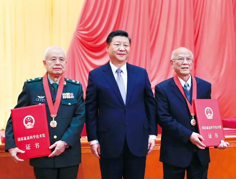 2019年1月8日,2018年度國家科學技術獎勵大會在北京人民大會堂隆重舉行。中共中央總書記、國家主席、中央軍委主席習近平向獲得2018年度國家最高科學技術獎的哈爾濱工業大學劉永坦院士(右)和中國人民解放軍陸軍工程大學錢七虎院士(左)頒獎。 新華社記者 謝環馳/攝