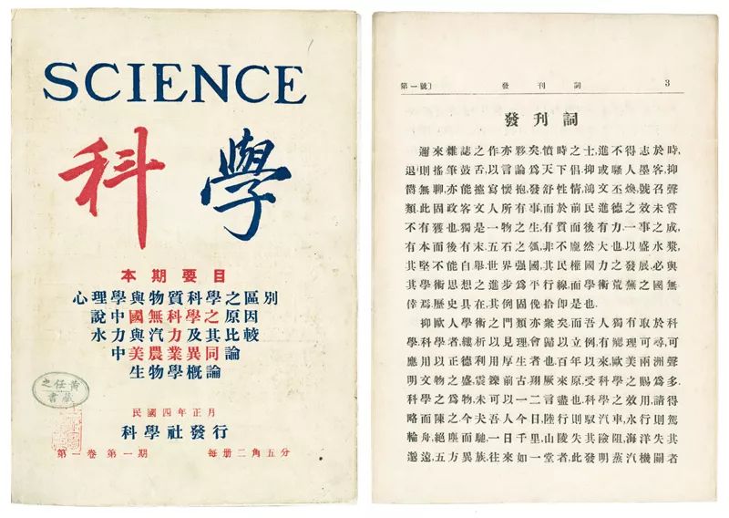 1915年1月,由任鴻雋、秉志、周仁等人發起的中國科學社創辦的《科學》月刊在上海首期出版,其發刊詞提出“世界強國,其民權國力之發展,必與其學術思想之進步為平行線”,并從“科學之有造于物質”、“科學之有造于人生”、“科學之有造于智識”,以及科學有助于提高人的道德水準四方面論述了科學的社會功能,開始了在中國傳播科學的事業。圖為《科學》雜志創刊號及發刊詞(首頁)。 上海圖書館(上海科學技術情報研究所)供圖