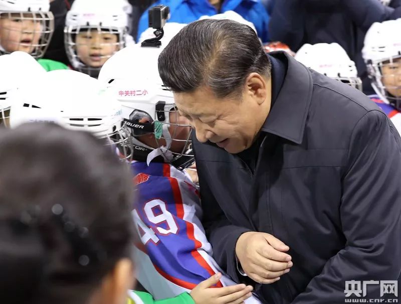 △2017年2月24日,習近平在北京五棵松體育中心觀看青少年冰球訓練,與一位小冰球隊員肩碰肩