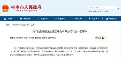 5月2日凌晨,神木市陜西恒源投資集團電化有限公司2#電石爐在停電處理爐內料面板結的過程當中發生塌料,導致高溫氣體和固體向外噴出。由于當時正處于交接班時間,致使現場作業的20人不同程度灼傷。傷員在第一時間全部送往醫院救治,其中2人搶救無效死亡,8人燒傷較重,10人輕中度燒傷。