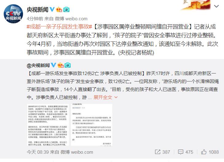 成都一游樂場發生事故致12傷2亡 系擅自開園營業