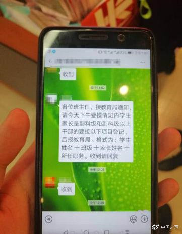近日,有微博用戶發文稱,山西朔州某中學要求統計初三學生家長的任職情況,引發網友熱議。朔州市朔城區第七中學老師接教育局通知,要求學生家長進行登記,如有副科級和副科級以上干部要進行上報,中考可能會有所照顧。
