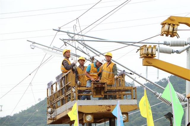 接觸網導線是高鐵通電運行的關鍵設施。中鐵武漢電氣化局具體梅汕客專項目部相關負責人表示,該鐵路需要架設接觸網導線406條公里,每條導線長約1300米,架設過程中,施工人員每隔300米檢查導線平直度,將誤差控制在每米不超過0.1毫米范圍。