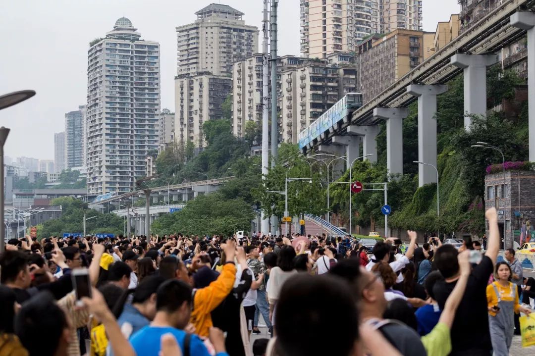 △5月2日,重慶市輕軌2號線李子壩站觀景臺,游客紛紛舉起手機拍攝輕軌穿樓。