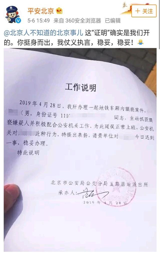 5月6日,有網(wǎng)友爆料稱,一小伙在北京地鐵上抓色狼時(shí),因見義勇為導(dǎo)致上班遲到,北京市公安局公交分局五路居派出所專門為他開具了一份《工作說(shuō)明》,“2019年4月28日,我所辦理一起地鐵內(nèi)猥褻案件,張山(化名)主動(dòng)抓獲嫌疑人并積極配合警方工作,為此延誤正常上班,警方對(duì)此提出表?yè)P(yáng),希望貴單位穩(wěn)妥處理。”