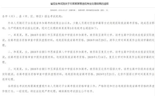 通報指出,外來人員隨遷子女在貴州省參加高考的政策出臺以來,少數人員通過空掛學籍等方式違規獲取貴州省高考資格,造成惡劣影響。為嚴明高校考試招生紀律,現對已處理的庫某某等3名違規考生通報如下: