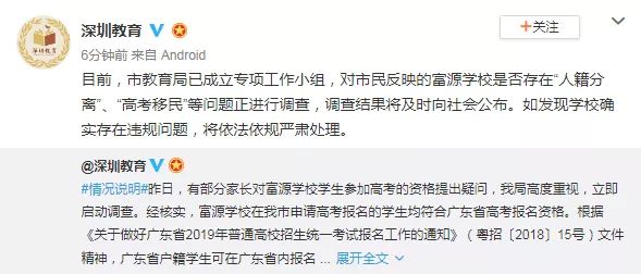 29日,深圳市教育局在其官方微博發(fā)布說(shuō)明稱(chēng),富源學(xué)校學(xué)生(包括戶(hù)籍在廣東省內(nèi)深圳市外的)均提供了戶(hù)籍所在地公安部門(mén)及深圳市學(xué)籍管理部門(mén)對(duì)其戶(hù)籍、學(xué)籍的審核證明,手續(xù)齊全、資料完整,符合在深圳參加高考的報(bào)名條件。