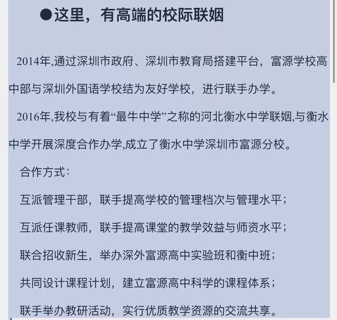 2016年11月,衡水中學(xué)深圳市富源分校揭牌成立。據(jù)2017年富源學(xué)校官網(wǎng)高中部招生宣傳,該校與衡水中學(xué)的合作辦學(xué)內(nèi)容中包括聯(lián)合招收新生,開(kāi)辦衡水班。
