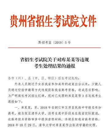 庫某某,男,2018年在銅仁市玉屏縣民族中學(xué)報(bào)名參加高考,被錄取至清華大學(xué)。該考生高中階段未在我省實(shí)際就讀,在高考報(bào)名資格審查中提供虛假材料,違規(guī)獲取我省高考資格。2018年10月29日,清華大學(xué)對庫某某作出取消學(xué)籍的處理。