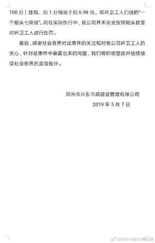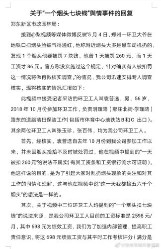 針對環衛大爺反映的情況,鄭州興東市政建設管理有限公司7日曾發函回復鄭東新區市政園林局。該公司表示,環衛大爺未因煙頭撿拾不及時被處罰過,“一天被扣260元”的說法不實。另外,該公司還透露,公司環衛工的工資標準為2598元,其中698元為績效工資,績效工資與平時考核(滿分100分)掛鉤,扣1分相當于6.98元,即為環衛工人說的“一個煙頭7塊錢”。而在實際執行中,未完全按照煙頭數量進行處罰。