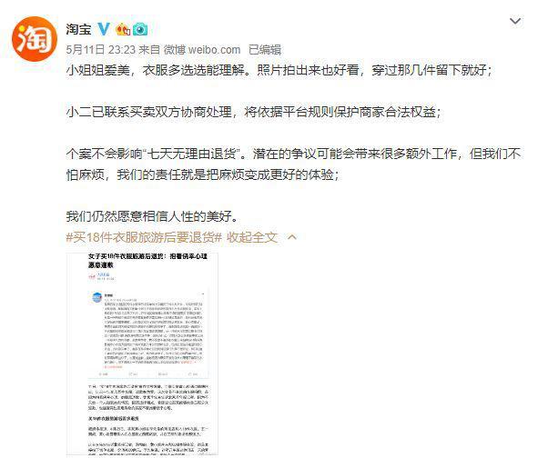 按照她的說(shuō)法,本周四(5月9日)已經(jīng)跟商家達(dá)成協(xié)議,拍過(guò)照片的衣服不退,但沒(méi)想到后續(xù)發(fā)展成這樣,這期間也遭到不少電話辱罵。(相關(guān)報(bào)道:姑娘網(wǎng)購(gòu)18件衣服全退,賣家看她朋友圈傻眼了!“七天無(wú)理由”到底包含哪些理由?)