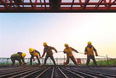 江西省南昌市洪都大道高架橋建設中,農民工兄弟們正齊心協力穿高架橋鋼索。黃建軍攝(人民視覺)