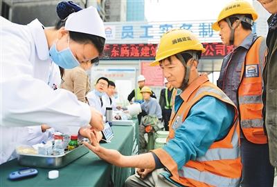 日前,安徽省合肥市廬陽區大楊鎮計生協、十張村聯合轄區醫院開展“維護人人健康 邁向全面小康”免費體檢進工地活動,免費為農民工測量血壓、血糖,并提供內科、外科等專科檢查。葛傳紅攝(人民視覺)