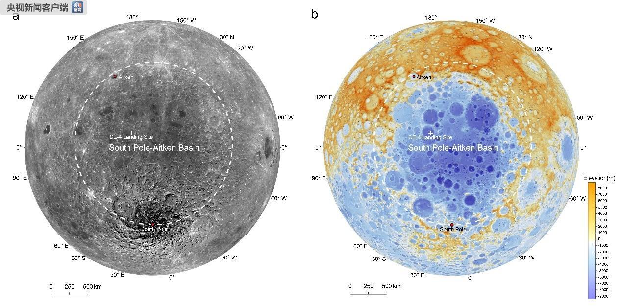 △月球南極-艾特肯盆地和嫦娥4號著陸點位置圖