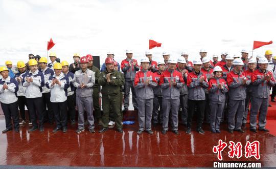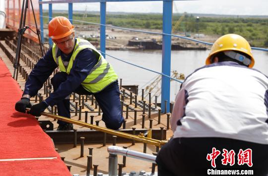 中俄雙方建設工人安裝合龍螺栓 呂品 攝