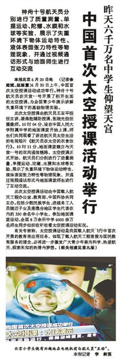 2013年6月21日人民日?qǐng)?bào)頭版報(bào)道太空授課。