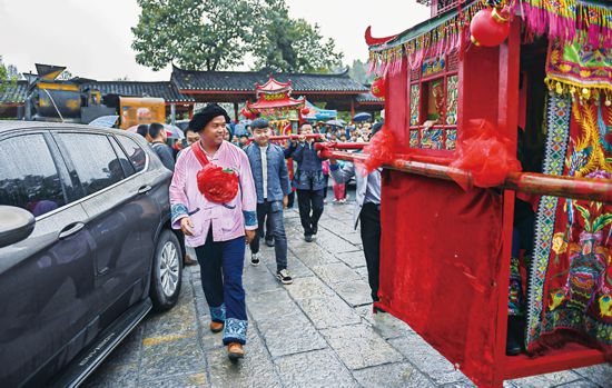 地處武陵山腹地的湖南省花垣縣雙龍鎮十八洞村曾深陷貧困,2013年全村225戶中有136戶是貧困戶,40歲以上的“光棍”有30多人。2013年11月3日,習近平總書記來到十八洞村考察,“同大家一起商量脫貧致富奔小康之策”,首次提出“精準扶貧”重要理念。2018年,已經脫貧的十八洞村人均純收入達到12128元,在實踐中探索出了一條脫貧與鄉村振興協同發展之路。 圖為2018年9月24日,“脫貧”又“脫單”的十八洞村村民施六金引領娶親隊伍進入婚禮現場。 新華社記者 李尕/攝