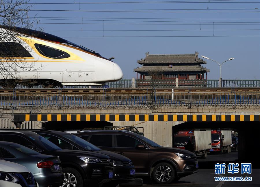 一列復興號動車組列車在北京永定門城樓附近的京津城際鐵路上行駛(1月25日攝)。新華社記者 邢廣利 攝
