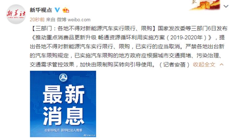 國家發改委等三部門6日發布《推動重點消費品更新升級 暢通資源循環利用實施方案(2019-2020年)》,提出各地不得對新能源汽車實行限行、限購,已實行的應當取消。嚴禁各地出臺新的汽車限購規定,已實施汽車限購的地方政府應根據城市交通擁堵、污染治理、交通需求管控效果,加快由限制購買轉向引導使用。(記者安蓓)
