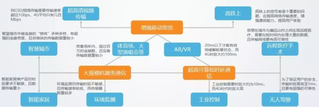 可以看出,5G的商用將是一個漫長的過程。其實目前,5G到商業成熟仍有較大距離。最簡單的以手機為例,上面提到的5G手機目前都是8000到一萬元以上的價格,業內人士說到2020下半年才會有平價的5G手機出現。今年年初,中國聯通就采取了一個出乎意料的舉措。在5G商用前夕,它提出了一個資金高達300多億的招標項目,而內容則是繼續擴建4G網絡,計劃再建41萬個4G LTE基站。這說明了4G網絡仍將長期存在,在5G的商用模式明確之前,運營商出于成本考慮,不會孤注一擲地大規模投入5G網絡建設。實際上,目前全球5G布局仍處在國際電信聯盟規劃的三階段的第一個階段。這三個階段指5G發展的三個應用場景:增強型移動寬帶、大規模機器類通信、超高可靠低時延通信。他們的具體應用如下圖所示: