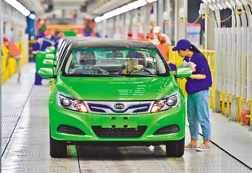 比亞迪西安基地總裝車間內即將下線的新能源汽車(6月12日攝)。新華社記者 邵 瑞攝
